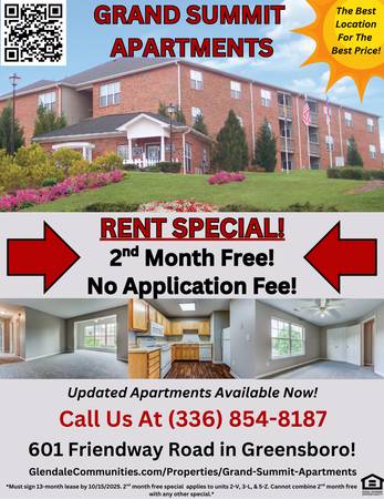 Enjoy your 2nd month rent-free when you sign a 13-month lease at Grand Summit Apartments by 10/15/2025! 2nd month free special applies to units 2-V, 3-L & 5-Z. Cannot combine with any other special.