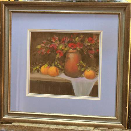 The painting is a classic still life. It has the perfect frame and will fit in perfect in your home or even office. I vote for finding a place for this treasure in your study. I am a local NC painter. Contact me to see it.