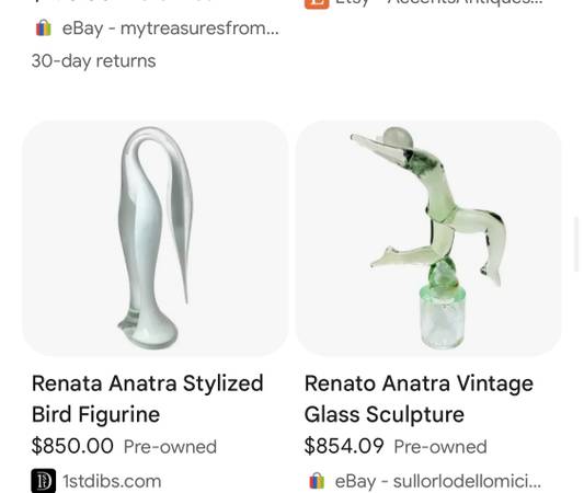 A deep black glass with a blueish hue to it when you look closely. Created by “Ranato Anatra Murano” and signed in etch on the back at the base. Cash only. No meet-ups. Thanks.