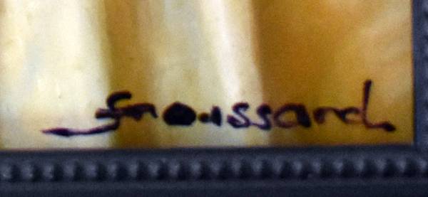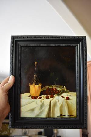 Original oil painting on wood panel. I know nothing about the painting or the artist other than I love their work. I have attached several photos so you can see the front, back and the signature close up. I hope it helps. Unfortunately the camera would not pick up the barest indication of a wine glass in the background of the painting. I included several photos to try to pick up the glass.