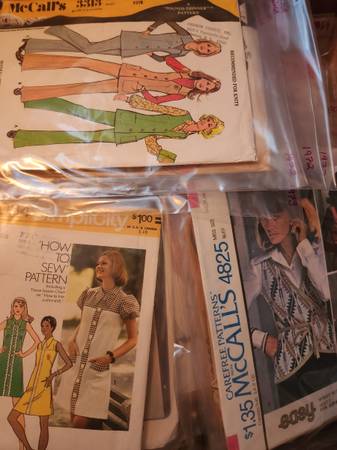 Approximately 75 vintage patterns. Most are 1970s, with a few newer. Mainly small womens sizes, teens/girls, and one or two men's. I have not checked them for completeness. Some are in comic book sleeves with pattern dates and the name and city of the estate where they were purchased.