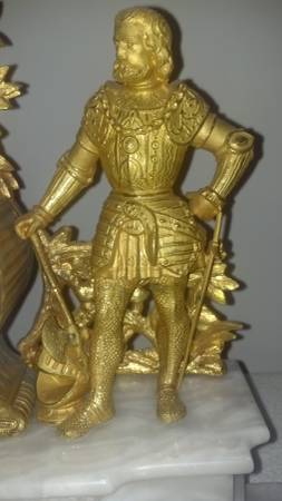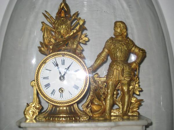 Depicting a standing armor-clad figure, the circular white-enamel dial surmounted by accoutrements of war, on an alabaster base with ormolu, metal and chains. 15 inches tall, 12 inches wide. The base and dome are also in excellent condition with no cracks or damage.