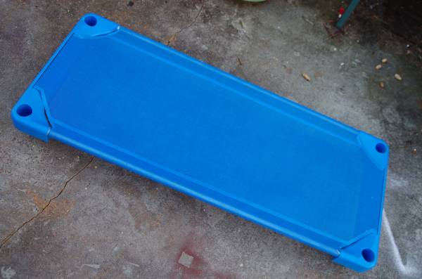 I have a (ONE! Everyone calling thinking i have many, I ONLY HAVE ONE LEFT!) child's cot like used in professional daycare centers all over the US. Its blue in color, and like brand new. It came from a new merchandise auction, so it may have been brand new actually. It measures 21 wide by 51.5 long. Stands about 6 or so inches tall. These sell new for around $60, and Im asking $30 firm. Honestly, I don't think it was ever used. Its $30 cash. Not $29. Hope that helps on the haggle thing. Its firm. Priced to sell fast. I have 5 buildings to finish going through. One is 3 stories tall. Just making room.