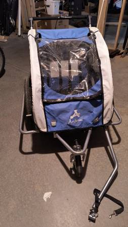 Pull-behind toddler bike trailer. 2 seats. Can be used as standalone stroller. Has a couple ripped spots, none affecting load bearing. Includes mount for rear of bike.