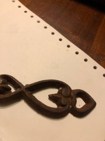 Has hearts and sun motiff in the center with small hole for easy fastening to something or hanging on a nail. Came within a set of other simple utensils. Probably made in Taiwan. Item is rusted and...