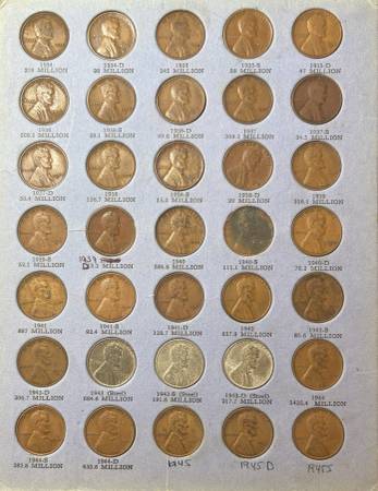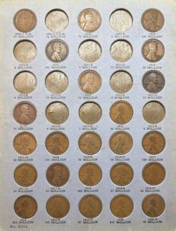 A unique Whitman Lincoln Head Cent folder from 1909 to 1945. Includes the first-year variety 1909 V.D.B. and all three World War II steel cents. In total there’s (86) Wheat Pennies in the album. While the coins are in good shape, the album is in poor condition and torn. I meet at the Food Lion in Randleman, NC if interested. #coins