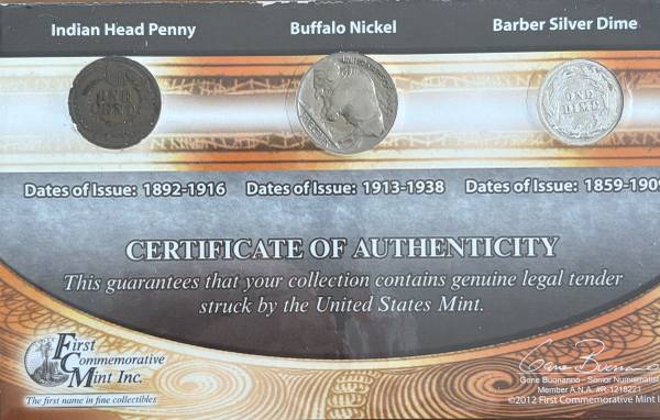 A set of classic old United States coins. Includes a 1902 Indian Head Penny, a 1936 Buffalo Nickel, and a 90% silver Barber Dime from 1911. I meet at the Food Lion in Randleman, NC if interested....