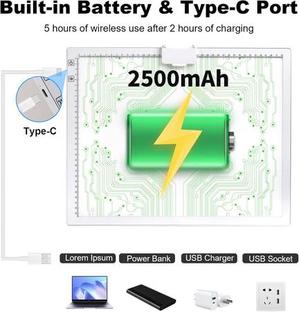 â—†[2500mAh Rechargeable Battery]--The A3 rechargeable light pad contains a 2500mAh lithium battery, which can work for 5 hours after 2 hours charging. Applicable to cordless use and charging while using.