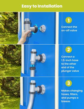 One-step Solution to On-the-stop: instant filter pump or filter cartridge changes. This plunger valve can efficiently and conveniently stop the flow of your pool. And also the plunger valve makes it easy to stop and start the water when doing the back flush process on the sand pump. With this pool plunger valve, you can spend more time swimming and less time maintaining.