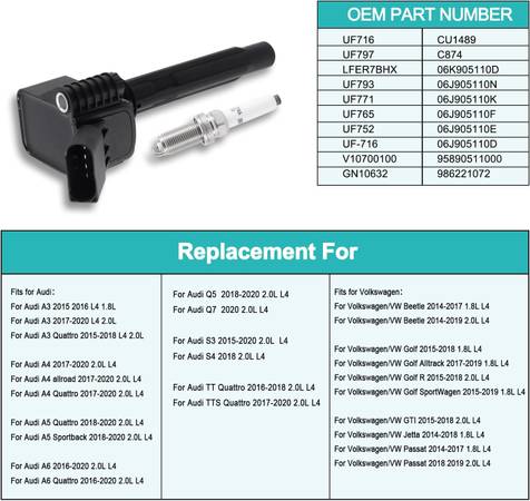 ăFitmentăFor Volkswagen/VW Beetle 2014-2017 1.8L /Beetle 2014-2019 2.0L, Golf 2015-2018 1.8L, Golf Alltrack 2017-2019 1.8L /Golf R 2015-2018 2.0L /Golf SportWagen 2015-2019 1.8L, GTI 2015-2018 2.0L, Jetta 2014-2018 1.8L, Passat 2014-2017 1.8L, Passat 2018 2019 2.0L; For Audi A3 2015 2016 1.8L, A3 Quattro 2015-2018, A3 A4 allroad TTS Quattro 2017-2020, A5 Quattro Sportback Q5 2018-2020, A6 Quattro 2016-2020 /Q7 2020, S3 2015-2020 /S4 2018, TT Quattro 2016-2018, TTS Quattro 2017-2020 2.0L L4