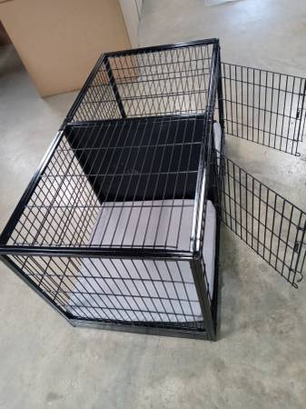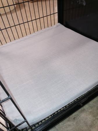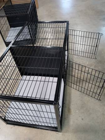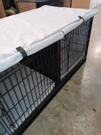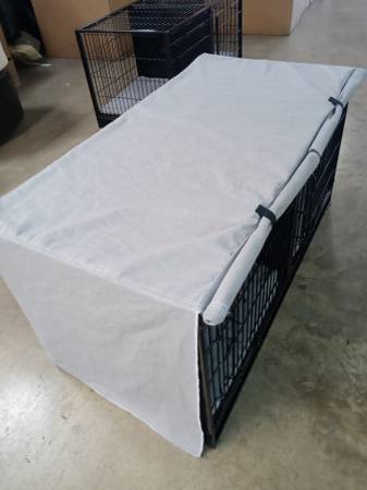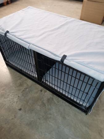 Extra-large double crate with steel divider for dogs or other pets, Pet Essentials, black, includes two new 24x24x1.5 pillows and a cover with two curtains that attach with Velcro for your pet's privacy. The price is economical: $70 each or both for $140.