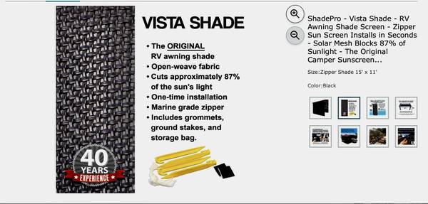 RV Sunscreen Shade for Awning, comes with storage bag and stakes- only used 4x. The Original RV awning shade screen with zipper! The Vista Shade zip sun screen rolls out flat, providing cooling shade, light wind-breaking protection, and an air of privacy wherever you roam without obscuring your view of the great outdoors. Perfect to help reduce glare on outside TVs, Tablets and Phones! Sunscreen kit includes grommets, ground stakes, and storage bag. The only awning screen shade you need.