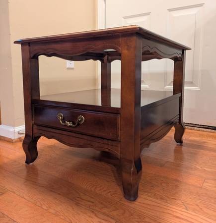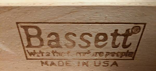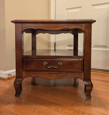 Like new condition. All solid wood construction. Beautifully designed the square-shaped clear glass insert easily lifts off the table. Very sturdy and well made by Bassett Furniture. Delivery available if needed. Text me thanks.