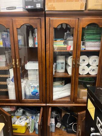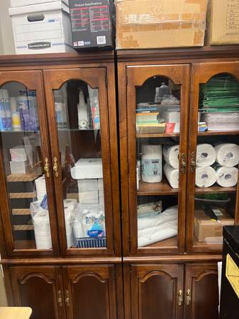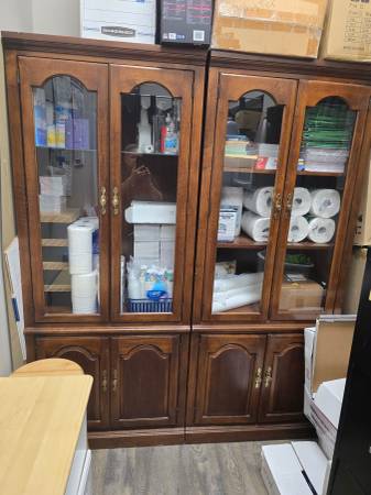Great condition multi use dual cabinets. Measuring 78”H x 32” wide x 18” deep EACH. So both cabinets side by side are 64” wide. Currently being used in an office environment. Great for storage or display. You could take off the glass doors for book cabinets possibly. Make an offer - serious inquiries only - thank you for looking