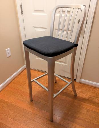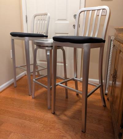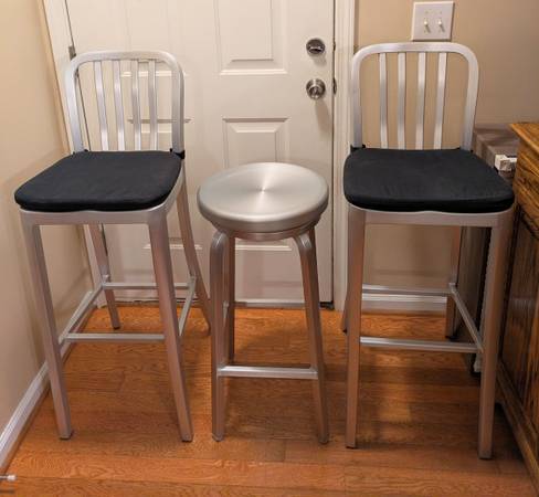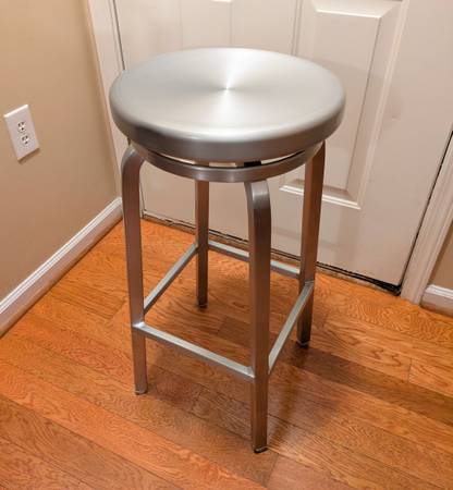Like new condition. Crafted of machine-cut anodized aluminum, each sturdy yet lightweight stool is welded together and hand polished to a soft sheen. The contoured back and molded seat ensure a comfortable sit. Plush cushion elevates the look and feel and attaches to the chair with fabric tab fasteners. Sturdy, durable. Classic and contemporary design. Round bar stools seat swivel softly.Delivery available if needed. Text me thanks.