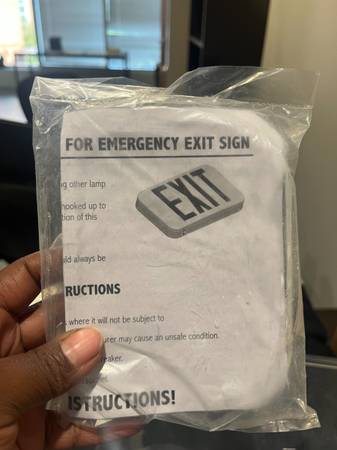 Exit Sign w screws and mount supplies. Posted items are as is where is with no warranty, terms are cash unless other payment terms agreed upon. Located at Premier Dr and Hwy 68, High Point NC....