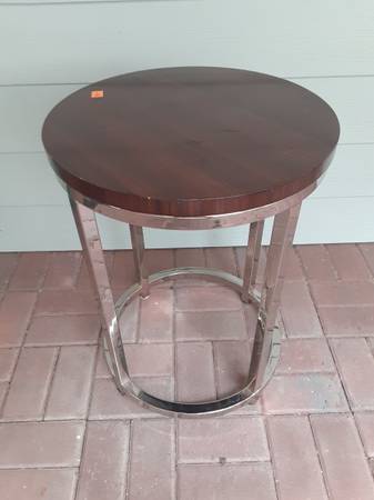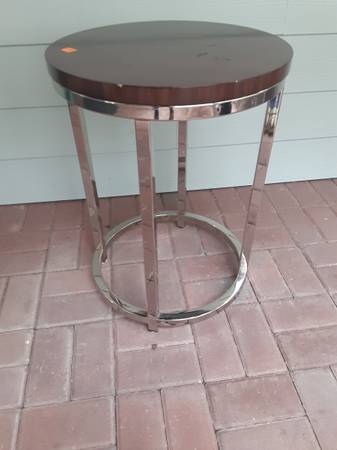 Round chrome and "wood" side table. Used but still in good shape. Can measure if needed. See my other ads for more low priced furniture and other items for sale due to downsizing.