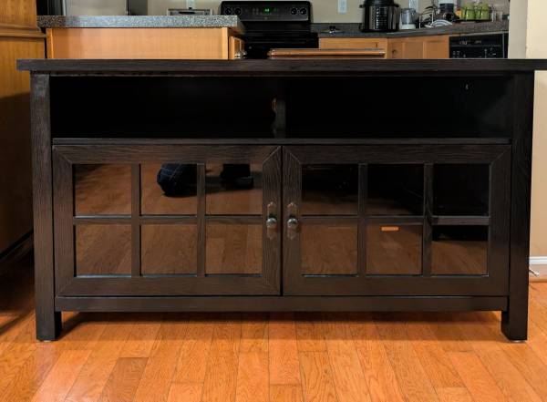 Like new condition. It includes two cabinet doors with clear, tempered glass panes and decorative mullions, as well as an open top shelf for media components. Solid Wood and engineered wood construction. Sturdy and durable. Delivery available if needed. Text me thanks.