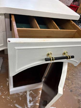 Upcycled buffet with center drawers and cabinets on each side. Painted white. Optional piece of granite on top.