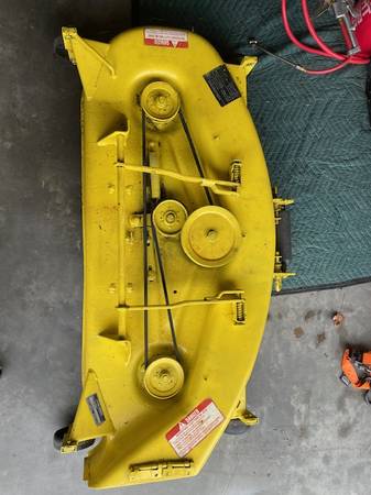 Overall good mechanical condition. Cosmetically fair. One small hole about the size of my finger tip (see picture) A bead blast and paint will make it look great if that is what you are after. I don't know how they rate the width, maybe a 46 or 48. There is a picture of the name plate to find out if it works on your tractor/mower. I have the mule and belt. Need a couple of brackets, thus the price.