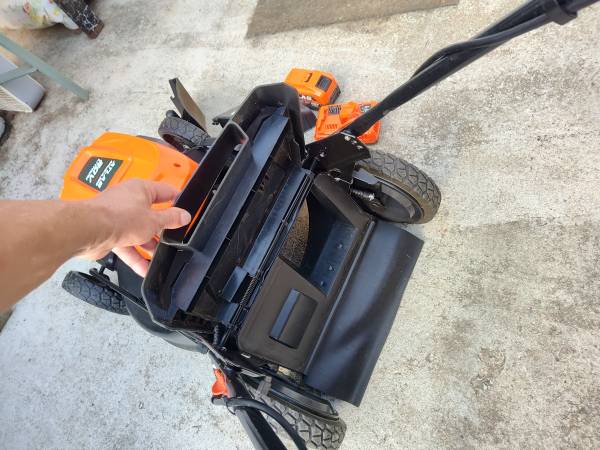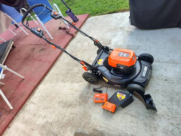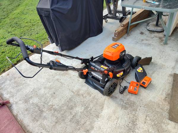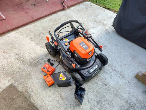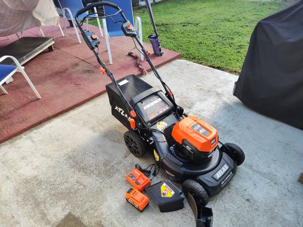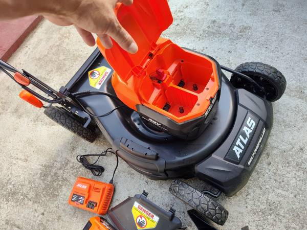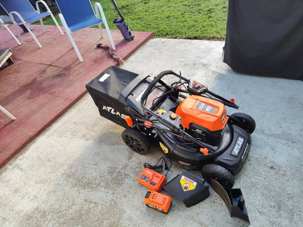 Atlas electric lawn mower with battery charger and one battery it's only like 6 months old runs good brand new really good more easy to use.