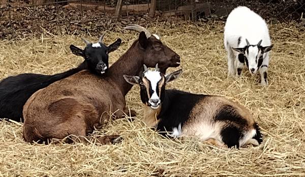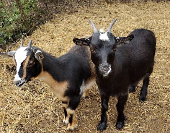 Five pygmy goats for sale.$100 each.Twin girls born Feb.15th.(Two together in 3rd and 4th pic mom laying down)Single male born June 9th(white one in last 2 pics)Male and female first two pics born...