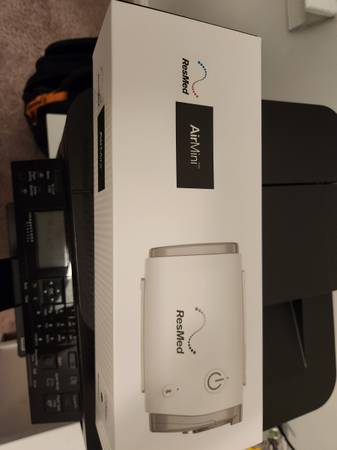 Selling a Resmed AirMini with little use (13 hours). I bought it for my travels, but couldn't get used to it (I have a regular AirSense at home, but mostly I stopped the CPAP treatment). I still have the original box for the AirMini. Includes a generic tube and the adaptor