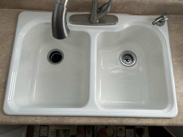 Double drop in Sink with Delta faucet with sprayer. Includes soap dispenser.