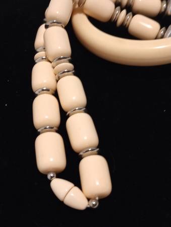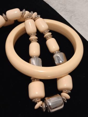 A chunky acrylic beaded necklace with matching bangle bracelet. Has beige and silver beads. Has a twist clasp. In good condition. Size 18 by 3/8 inches