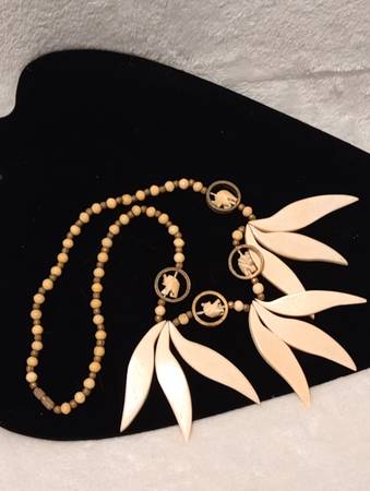 17" Vintage hand Carved Bone necklace with tropical leaves and four elephants with wooden beads. Screw closure. I meet at Walgreens on Van Buren in Eden.