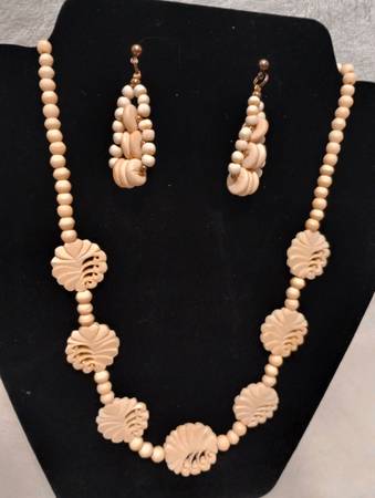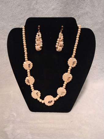 Approximately 18" Vintage Carved Bone Necklace with Wooden Beads and Matching Earrings.