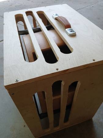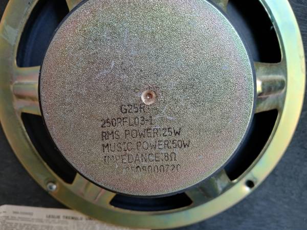 Two speed Leslie speaker from an old organ, currently only set up for fast speed. Baffle and motor are mounted on the original board and are enclosed in a homemade box. Works well; spins freely and quietly. All it needs is a permanent power cord and a instrument plug for the speaker and it is ready to go.