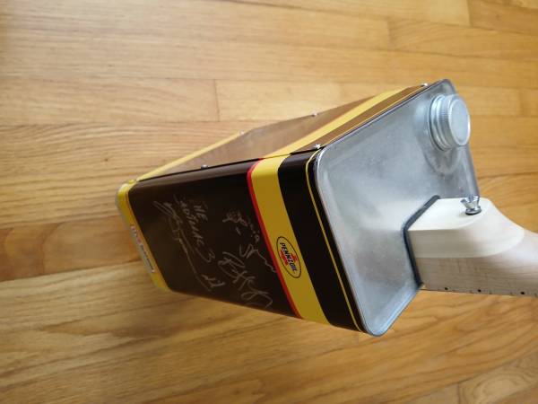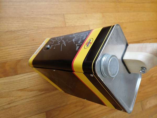 Guitar made from an oil can, set up with Gibson style parts. Built by Bohemian guitars. Has been signed by some bands; The Cadillac 3 and Judah and the Lion are the only legible ones. No texts,...