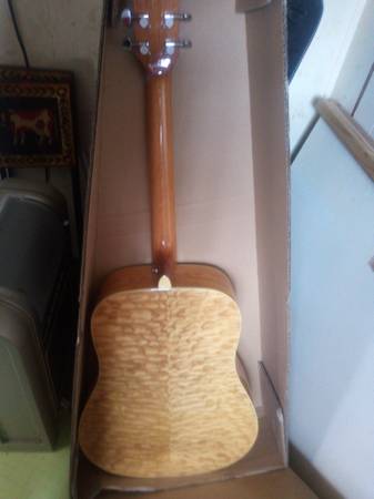 Idyllwild acoustic electric and built in tuner, been set up, saddle nuts has been upgraded. Inspiring and Stunningly Functional or Functionally Stunning? No matter how you look at it or play it, the Idyllwild Quilted Ash Acoustic Guitar is as brilliant to look at as as it is to hear. Not just another pretty face, quilted ash produces firm bass tones, bite in the midrange, and airy highs, all with exceptional sustain. On stage or in the studio, your sound is captured and delivered by a Fishman Isys+ Pickup. It's in the original box with gig bag, I just don't play it, no need to keeping it. $225
