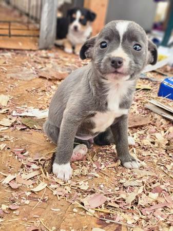 Small breed puppies. Both parents are chihuahua mixed breeds. Small rehoming fee. 2 girls (all gray) and (black one) and 2 boys (brown eyebrows and gray) and (brown and black and white). 6 weeks old. Message for more pics and info. Mom and dad pictured first. 4 puppies total.