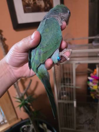 4 month old quaker. Does not like other males. He is a male. He is very local, loves to be talkeded to. Beautiful turquoise blue. He comes with a cage and everything he needs. If your looking for a 200$ bird this is not the bird for you. He cost 1400 at the petstore. He also requires more than a seed diet. Im not asking what we paid but he is not free either. 600 for him and all his belongings. He was handfed so his nips do not hurt at all. Can send videos or more pics. Have a Blessed day. Located in burlington.