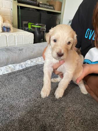 I have 3 male and 1 female golden doodle puppy to rehome for a fee. They are currently 5 weeks old and are looking for a forever home. I have plenty of info about them and their parents just message...