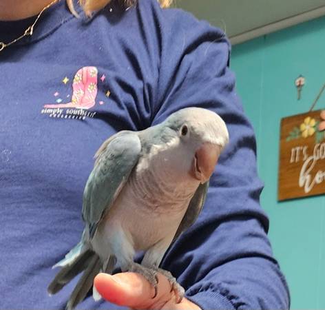 Blue Quaker pair. Checked by breeder bought from pretty certain male and female. 4 months old. Can be handled. Hand tame. They were hand fed. I just don't have the time I need for them. Excellent birds. Eat and love pellets. Eat seeds. Sold together with cage and 3 bags unopened seed and pellet medley. Rehoming fee.