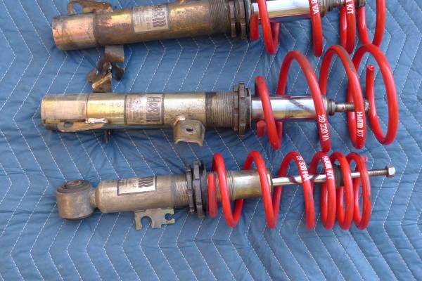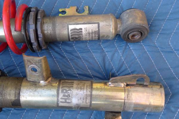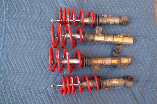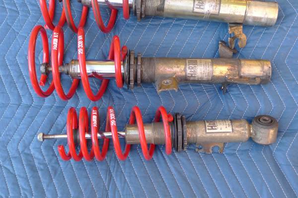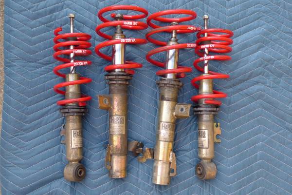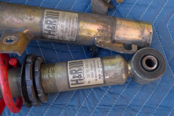 Set of used German-made H-R Coil Overs for Gen 1 MINI Cooper (2002-2006 Hatch, and 2007-2008 Convertible). In good condition. Removed at 25,000 miles, with plenty of miles left. The set is as shown. There are some surface discoloration due to age, and some rub marks on spring coils due to normal wear.