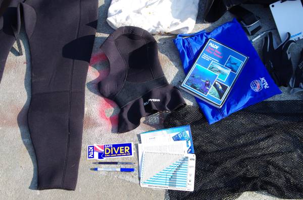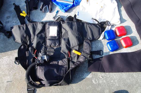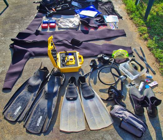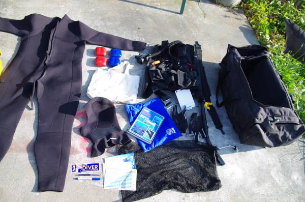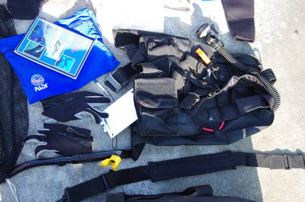 I could easily ask a LOT more money for this, but pricing it to sell. It looks to be a full setup for either a scuba professional or a beginner. I say professional because theres a vest with a clipboard and pen tucked away in one of the pockets. Also books and literature.