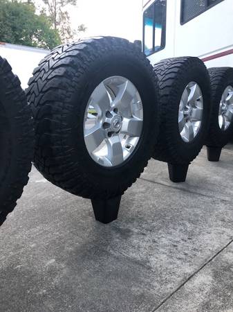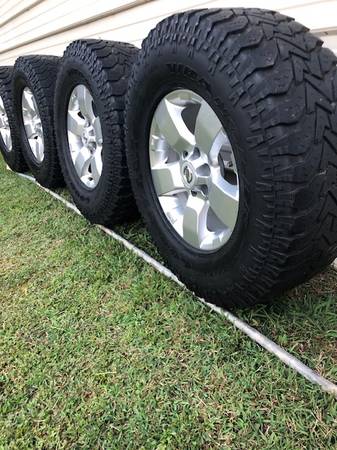 4 Goodyear Wrangler Authority A/T tires. Size: LT 265/75 R16 m+s. Tires are only 1 year old. Rims fit the new model Nissan 6 lugs. All 24 lug nuts. Asking: $800.00 OBO.