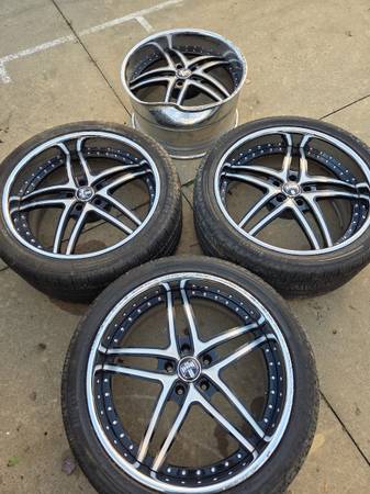 Selling a set of 22 inch wheels for a 5x5 pattern. These fit c10 trucks and 90s c1500 Silverados with a 5 lug pattern. They are DUB axiom c16 wheels. One wheel is bent but could possibly be fixed. Tires arent that great. One wheel is over $2000 new. Selling the set of 4 for $500.